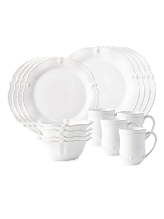 From the Berry & Thread Collection. Adorned with a sprinkling of berries and a flutedsilhouette, this16 pieceset in whitewash provides service for four and includes fourdinner plates, dessert/salad plates, bowls, and mugs.