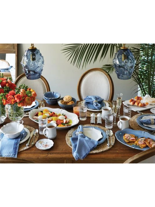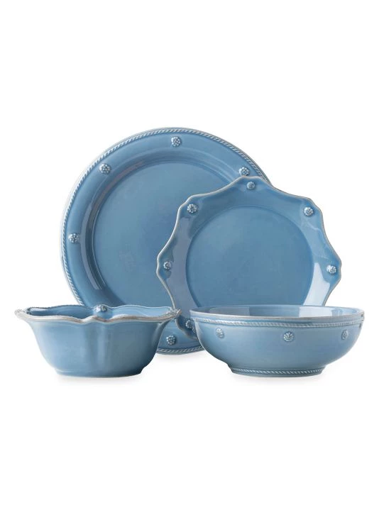 From the Berry and Thread Collection. Rimmed with a simple thread and adorned with a sprinkling of berries, this iconic ceramic dinnerware embraces historic motifs in a sublime blue hue. Set includes a round dinner plate, scalloped dessert/salad plate, cereal/ice cream bowl and a coupe pasta bowl.