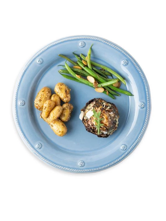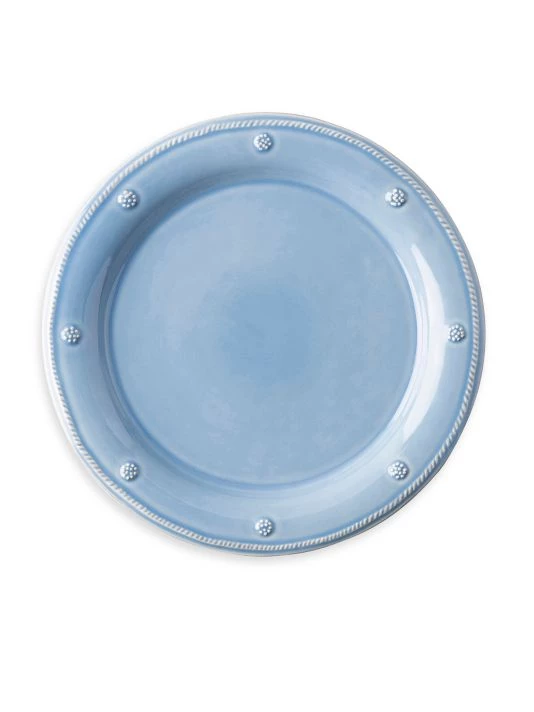From the Berry and Thread Collection. Round glazed ceramic dinner plate rimmed with a simple thread and adorned with a sprinkling of berries. This iconic dinnerware collection embraces historic motifs in a sublime blue hue sure to infuse your table with everyday sophistication.