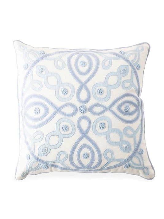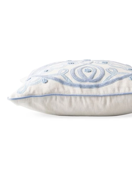 Inspired by the parterre garden design of the stunning L’Andriana garden in Italy, this two-toned chambray pillow is made of luxurious soft linen, adorned with velvet appliqué, and finished with hand-stitched French knot detailing.