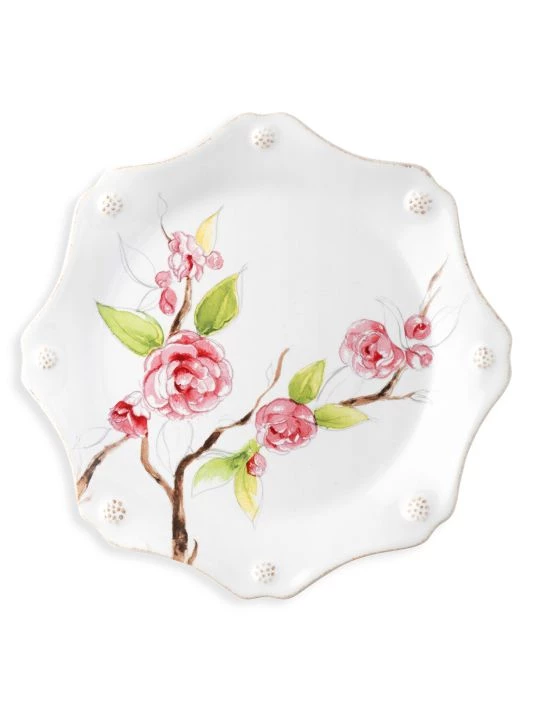 From the Berry & Thread Floral Sketch Collection. With a cascade of deep pink Camellia blooms, our floral sketch dessert/salad plate is an expression of spontaneous pencil and paint strokes in the form of dreamy watercolors upon the canvas of our iconic berry and thread motifs. Nothing is more special than a table set with works of art.