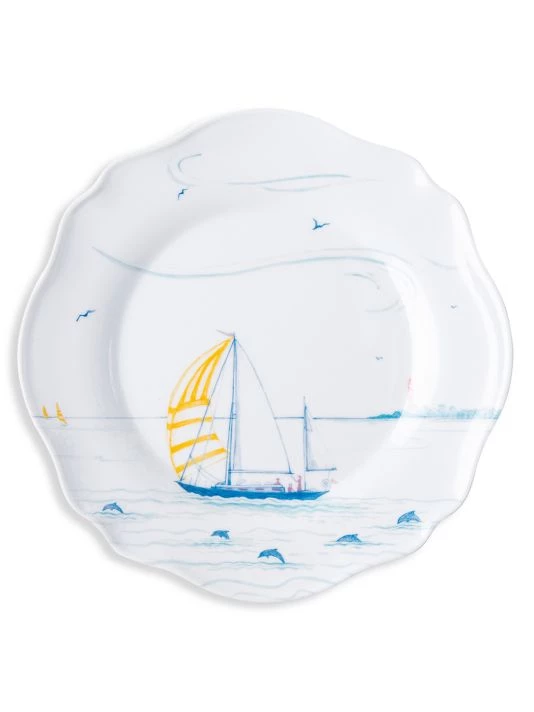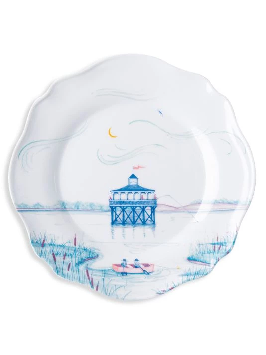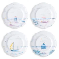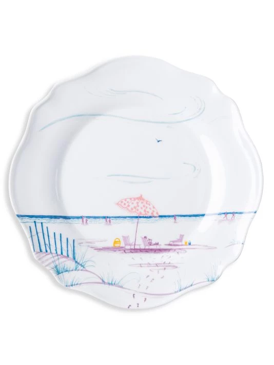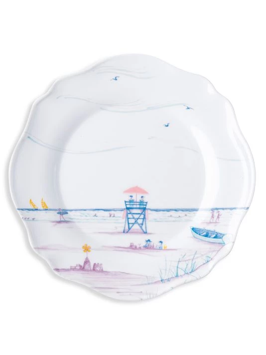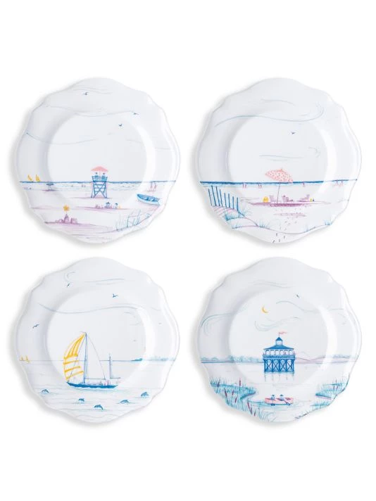 From the Country Estate Seaside Collection. This charming set of four scalloped melamine dessert and salad plates features: The pier, a beach umbrella, a sailboat and a lifeguard stand — each beautifully depicted in a calming palette of pastel hues on a durable melamine base.