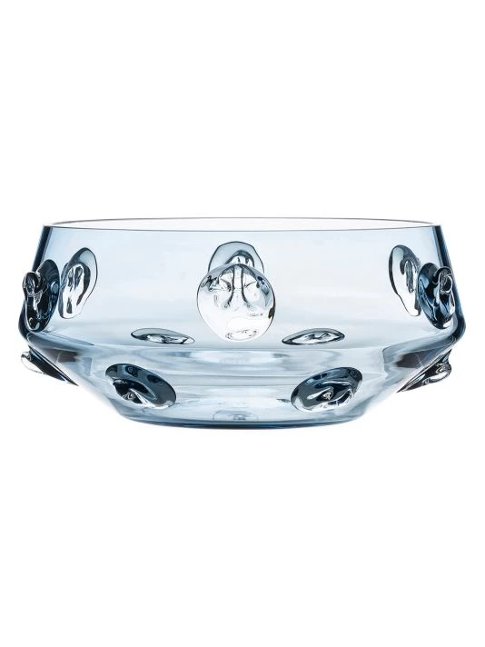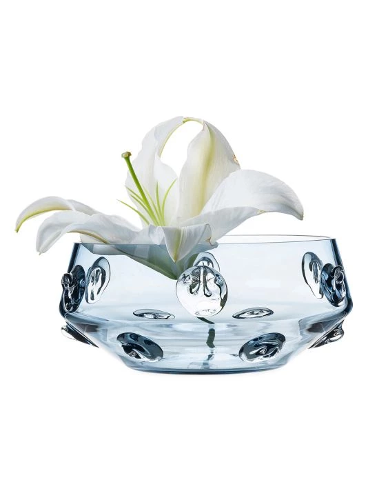 Whether centered at your table with varied fruits or serving your guests in its shapely elegance, 10 Florence bohemian glass bowl makes one feel they are beholding something special. Mouth-blown with hand wrought abstract motifs called `prunts’, this stunning work of art has a tactile texture and striking blue hue. The whimsical and uniquely detailed glasswork can stand alone as a sculptural work of art or hold your flowery beauties with graceful flair. We also love it potted with a magnificent orchid on side table. Each piece is hand signed.