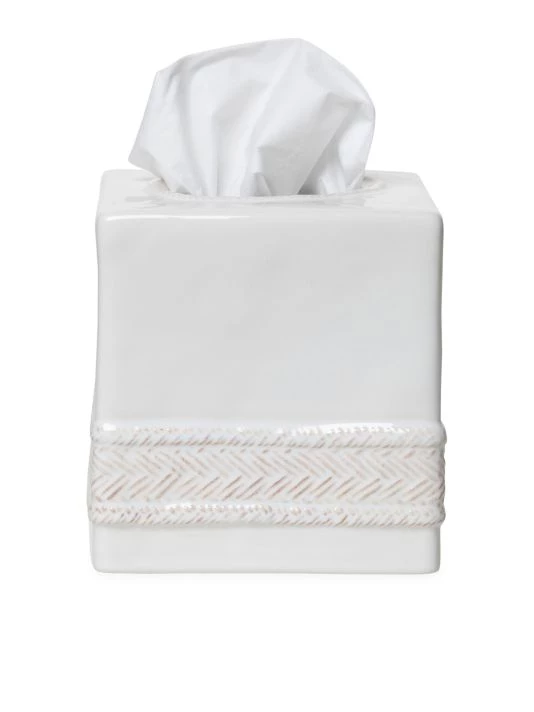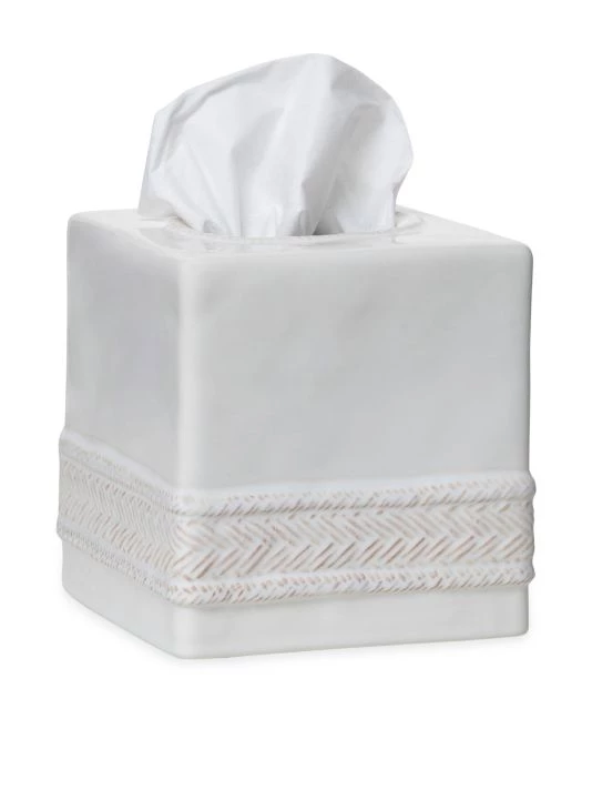 From the Le Panier Collection. Bright, fresh, and classic, this elegant tissue box cover is trimmed with Juliska’s Le Panier braid design.